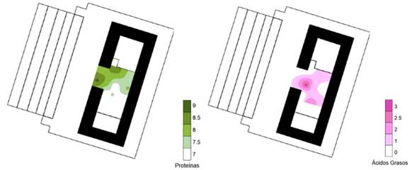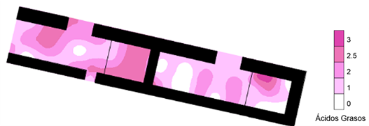 Los ácidos grasos se agrupan en los costados y al norte, alejados de la entrada al cuarto, al igual que las proteínas (Figura 26). Sus valores son intermedios, concentrándose en una de las esquinas; no obstante, la conjunción de proteínas y ácidos grasos, así como la distribución en las orillas de los residuos químicos, puede ser la confirmación de que el cuarto fue un área de almacenamiento de bienes vegetales o animales.