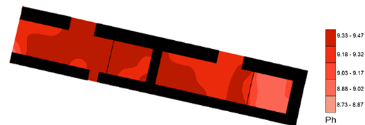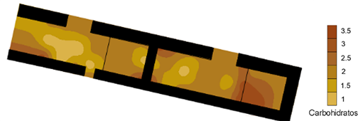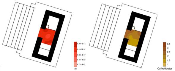 Los valores más altos de pH se encuentran en la mitad poniente; sin embargo, como ya se mencionó, no presentan cambios significativos entre ellos, y los valores más bajos pueden relacionarse al deterioro químico del piso y, por lo tanto, a la pérdida de su alcalinidad (Figura 14). En el caso de los carbohidratos (Figura 15), hay algunos valores más altos que los encontrados en GZ3, y se encuentran cerca de los vanos de la estructura, así como en la sección norte.