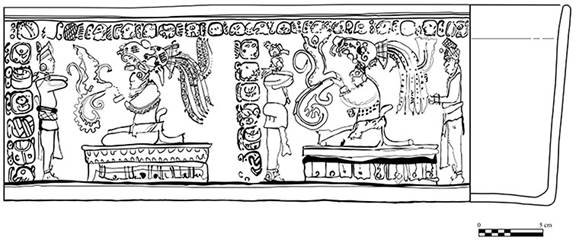 Es interesante notar que las áreas con valores altos de residuos en esta estructura están concentradas en la entrada y cerca de la banqueta norte, la cual es más grande que la banqueta sur, lo que, junto con los enriquecimientos, hablaría de su importancia ritual. La distribución de los residuos químicos, como ácidos grasos y proteínas, se puede relacionar con la función ritual de GZ1, así como la escena iconográfica plasmada en un vaso cerámico con pseudoglifos, encontrado como parte del ajuar funerario del Entierro 1 en esta misma estructura (Figura 22); en él se observan rituales de fuego realizados por dos personajes ricamente ataviados con tocados, cada uno en una banqueta diferente, emitiendo lo que parece ser una flama (Tsukamoto et al., 2015: 207).