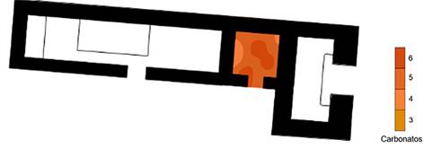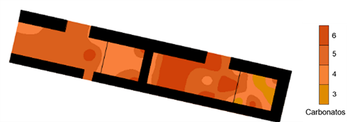 En contraste, los niveles de carbonatos en general son altos, a excepción de algunos puntos cercanos a los accesos de la estructura; también se puede observar una ligera disminución de ellos al centro de la misma (Figura 11). De lo anterior, podemos inferir que el aumento de carbonatos indica que las actividades realizadas no fueron intensivas, lo que permitió conservar alta su proporción. Otra explicación que hay que tener en cuenta es el factor del tiempo, ya que quizá este piso fue construido en una época posterior al de las otras estructuras, lo que le impidió enriquecerse de la misma forma.
