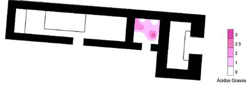 Es interesante notar que los ácidos grasos, al igual que las proteínas, se concentran en las banquetas, lo cual reforzaría la propuesta del servicio y consumo de alimentos en esos espacios más que su preparación, ya que no se encontró evidencia alguna de un fogón dentro de la estructura, lo que sugeriría que la cocción se realizaba en otra parte, posiblemente al exterior de la misma.