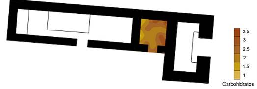 El pH del cuarto presenta valores altos, lo cual, al igual que en el caso de la Estructura GZ1, puede estar relacionado con la ceniza que se encontró como parte del ritual de terminación (Figura 27). Asimismo, la excavación detectó una mancha negra en la esquina noreste, donde los valores de pH son más altos, quizá producto de la quema del piso durante el mismo ritual (Tsukamoto y López Camacho, 2011: 146). Los carbohidratos, al igual que los otros residuos, muestran un patrón de enriquecimiento en las orillas, con las concentraciones más altas al norte y oriente del cuarto (Figura 28).