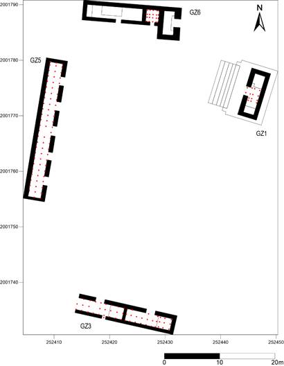 Las muestras de piso correspondientes a las Estructuras GZ6 y GZ1 fueron tomadas parcialmente durante la temporada de campo 2010-2011, con el fin de usarse en análisis químicos posteriores. Al tratarse de espacios más pequeños, ambos cuartos se dividieron en una cuadrícula de 0.50 x 0.50 m, de donde se extrajeron bloques de muestra que se almacenaron en la Escuela Nacional de Antropología e Historia (Tsukamoto y López Camacho, 2011: 149).