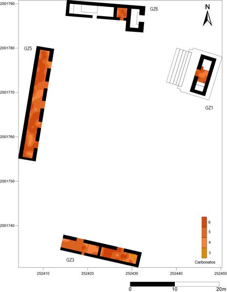 Los niveles de fosfatos en el área muestreada son en general bajos, a excepción de la entrada al templo y la parte norte de la estructura (Figura 16); asimismo podemos notar que, al igual que GZ5, presenta un piso con altas concentraciones de carbonatos (Figura 17), lo cual se puede explicar por su función ritual como templo y por las restringidas actividades que ahí se llevaban a cabo, lo que preservó el piso.