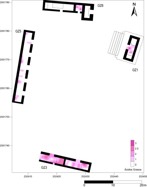 En la Estructura GZ1, las proteínas se concentran en el vano, así como en la mitad norte de la estructura, mientras que la mitad sur prácticamente no tiene rastro de ellas (Figura 18). Los valores en este cuarto son más elevados que en las dos estructuras anteriores, lo cual puede estar relacionado con su función de templo, donde se habrían desarrollado actividades rituales (Tsukamoto et al., 2015: 215). En dichas actividades quizá se utilizó una ofrenda de sangre humana o animal, lo cual explicaría las altas concentraciones protéicas en esta área reducida (Barba et al., 1996: 149; Ortiz, Barba y Pecci, 2017). Aunado a lo anterior, el cuarto presenta un enriquecimiento homogéneo de ácidos grasos (Figura 19), con la mayor concentración cerca de la entrada que, al igual que las proteínas, puede estar asociado con la actividad ritual que ahí se llevó a cabo, y que pudo implicar el uso de alguna resina con ácidos grasos vegetales o alguna ofrenda con grasas animales (Barba et al., 1997).