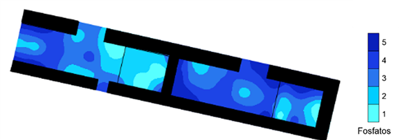 En el mapa de distribución de fosfatos (Figura 4), se puede notar que el valor más alto se presenta en las esquinas u orillas de la estructura, donde, en general, se concentran más los residuos, lo que concuerda con lo encontrado en los estudios etnográficos y arqueológicos mencionados. El valor de fosfatos más alto se encuentra en los pisos de ambos cuartos y en la banqueta oriente, mientras que la banqueta poniente tiene un enriquecimiento de fosfatos en concentraciones más bajas que el resto de la estructura, a excepción de tres esquinas, quizá porque las actividades realizadas en ella fueron menos intensas y/o frecuentes, lo que enriqueció poco esta área.