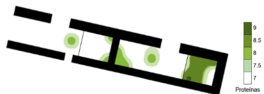 En el caso de las proteínas, se puede notar que se concentran en el sector norte de la estructura y sólo una pequeña cantidad cerca del tercer vano, de sur a norte (Figura 12). Esta distribución no es clara, debido a que los otros valores no apoyan la idea de que GZ5 haya sido destinada a preparar o consumir alimentos.
