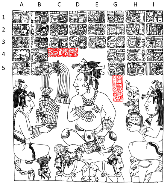 De acuerdo con las “restricciones espaciales” del soporte, estas contextualizaciones de elementos pictóricos pueden realizarse a través de varias estrategias. Una primera estrategia es la inserción de leyendas escritas en el espacio pictórico mismo, realizadas lo más cerca posible de la representación que actualizan. Es el caso en la Figura 5 (bloques coloreados en rojo), donde el nombre propio y un título del padre del gobernante K’ihnich Ahkal Mo’ Naahb’ III, “Tiwo[ol] Chan Mat, ch’ok”, aparece arriba a la izquierda de la imagen, y el nombre de la madre, “Ix-Kinuw Mat, ch’ok”, arriba a la derecha. Como podemos ver aquí, el protagonista central de la imagen no recibe tal tipo de identificación, sin embargo, las de sus padres junto con la identificación de la escena, una transmisión hereditaria de insignias de poder, hacen innecesaria cualquier otra información. Lo mismo ocurre para la contextualización temporal, porque este evento ha sido fechado en el texto.