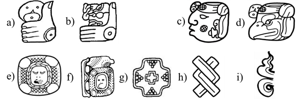 Figura 6 a) glifo CH’AM, “recibir”; b) conflación de los glifos CH'AM, “recibir”, y K'AWIIL, “(dios) K'awiil”; c-d) variantes del glifo AJAW, “noble, señor, etc.”; e) glifo PAKAL, “escudo”; f) difrasismo u-TOO’K’ [u-]PAKAL (El Tortuguero, Monumento 6); g) glifo CH’EE’N, “cueva”; h) glifo JAL, “trenza”; i) glifo K’AHK’, “fuego”.