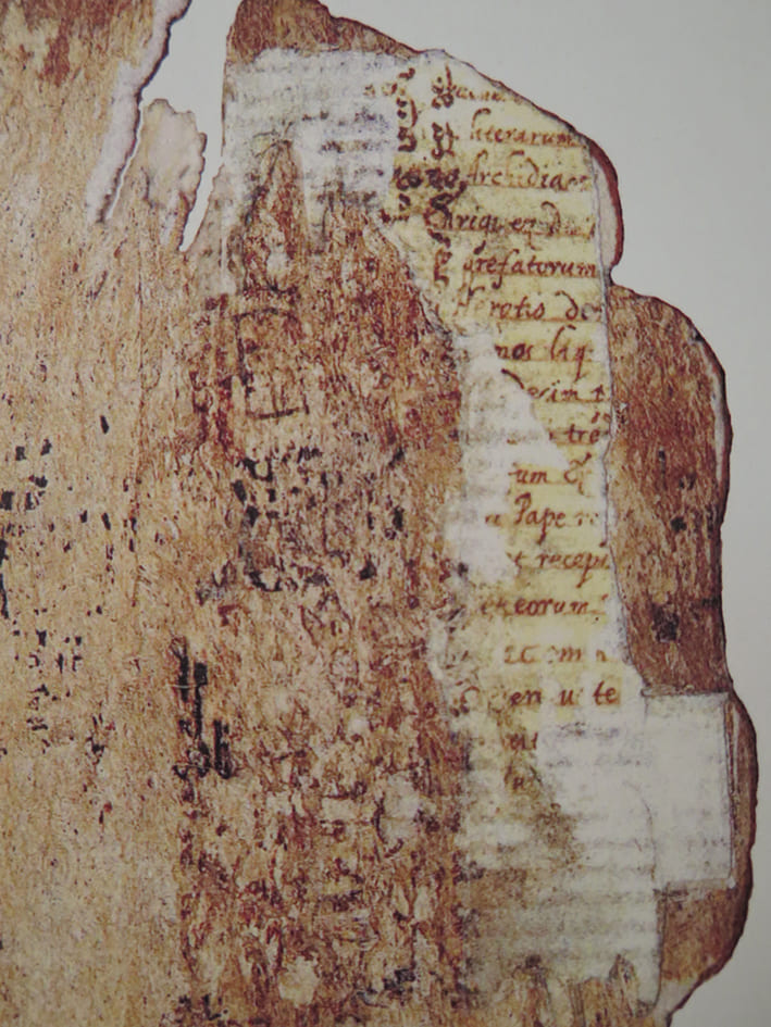 Chuchiak (2004) lo argumentó así: las palabras discernibles en un lado del parche están en latín e incluyen términos que significan “arcediano”, “papa”, “prefecto”, “herético”, “receptor”, el nombre “Enrique”, así como algunos otros fragmentos de lectura mucho menos segura. Las palabras fueron escritas en un estilo que los paleógrafos llaman “itálica bastardilla”, un estilo que se extendió al Nuevo Mundo a mediados del siglo XVI. La escritura al reverso del parche está en español y parece incluir una abreviatura del término “santa”, la preposición “de” y lo que podrían ser las letras finales de la palabra “obispado” (Chuchiak, 2004: 65-67; 2006: 123-124). Estas palabras fueron escritas en un estilo obviamente diferente, llamado escritura “cortesana”, que según Chuchiak quedó en desuso en el Nuevo Mundo en la primera década del siglo XVII. Chuchiak infirió que la presencia de los dos estilos de escribir indicaba que el parche fue creado entre 1575 y 1610 (Chuchiak, 2004: 64). Esta combinación de hechos -las palabras descifradas y el estilo de escritura, junto con una evaluación plausible del número total de palabras en el documento original del cual se cortó el parche- indicaron a Chuchiak que el parche “puede haber tenido algo que ver con las bulas papales de la Santa Cruzada”, y que era “posiblemente una copia manuscrita de la bula, o puede haber sido una comisión de un comisario local de la Santa Cruzada” (Chuchiak, 2004: 68).1