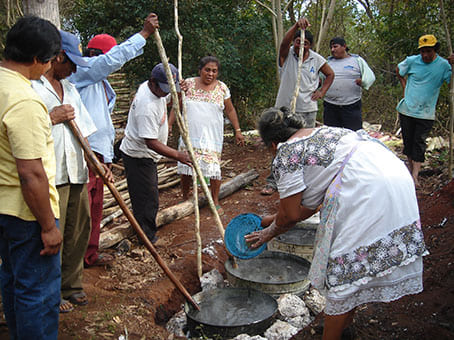 Después de haber colocado la madera y las piedras en el fondo del píib, dos hombres empiezan a prender la leña. Aparentemente, uno de ellos tiene dificultades para encender la llama, por lo que su colega le grita sonriendo: ¡Síis k’abech! (¡Eres mano fría!).