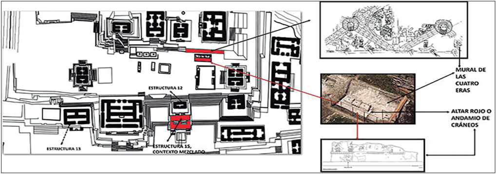 Figura 1 Acercamiento a la plataforma 5 y 6. Se señala el lugar del hallazgo del osario, el Mural de las Cuatro Eras y el Altar Rojo. Tomado y modificado de: Óscar Reyes Sánchez. Director de Proyecto: Dr. Juan Yadeun Angulo, octubre 2014; Taube, 2017: 33; Sánchez, Sheseña y Yadeun, 2018: 10.
