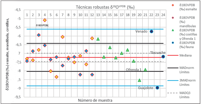 Para el procesamiento de los datos isotópicos se aplicaron pruebas estadísticas robustas como el método: MADnorm, 3MADnorm y MADQ3 (Lightfoot y O’Connell, 2016), bajo el supuesto de que es posible describir la distribución de la población subyacente que representa la mayoría de los datos, así como detectar aquellos valores que no encajan o son identificados como atípicos (outliers).