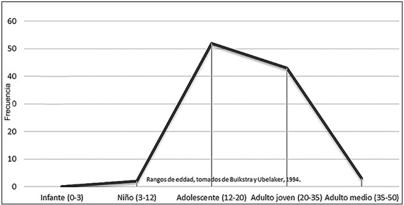 En cuanto a la observación morfoscópica en cráneo y pelvis para la asignación del sexo, se obtuvo una mayor frecuencia de individuos masculinos que femeninos, tanto en la región del cráneo como de la pelvis: 86% de los individuos son masculinos y 14% son femeninos (mandíbulas: 20 femeninos y 110 masculinos; escotadura ciática mayor: 27 femeninos y 33 masculinos). Esta composición desigual pudiera relacionarse con una selección de individuos, ya que no corresponde a la distribución normal de una población. Esto mismo se corroboró con el segundo método empleado, donde 67% de los huesos corresponden a masculinos, 16% a femeninos y 17% no determinados (mandíbula: 13 femenino, 87 masculino, 56 indeterminado; patela derecha: 23 femenino, 91 masculino, 11 indeterminado; patela izquierda: 31 femenino; 105 masculino, 6 indeterminado). Respecto a la edad, se encuentran representados todos los grupos etarios: desde individuos infantiles hasta adultos medios. Sin embargo, hay una mayor frecuencia de individuos que van de los 16 a los 25 años de edad; esto estaría indicando una selección de grupos de edad específicos: adolescentes y adultos jóvenes (véase la Figura 3).