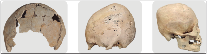 Figura 4 Izquierda: lateral izquierdo de cráneo masculino no modelado. Centro: lateral izquierdo de cráneo femenino con modelado tabular oblicuo. Derecha: lateral derecho de cráneo masculino modelado con tabular erecto bilobulado. Fotos de Judith Ruiz.