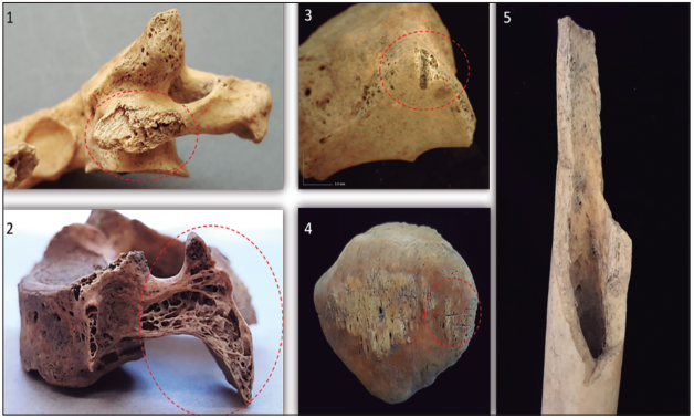 Figura 5 1: Atlas con desprendido; 2: Tercer cervical con corte de hueso; 3: Tercer cuña derecha con aplastamiento; 4: Patela con cortes sobre hueso; 5: Diáfisis de húmero con fractura del eje y exposición térmica indirecta. Fotos de Judith Ruiz.
