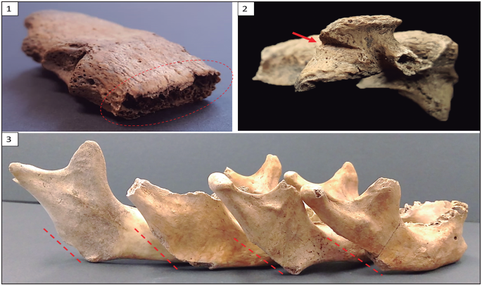 Figura 7 1: Esternón cortado en dirección antero-posterior en su tercer espacio intercostal, se observa aplastamiento del hueso por la entrada del instrumento cortante; 2: Vista lateral de cuarta vértebra cervical con corte sobre hueso en proceso articular inferior; 3: Vista lateral derecha de mandíbulas con corte de hueso en gonión, además de desprendimientos en el área por afectación posterior-anterior.