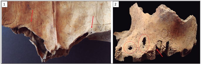 Figura 8 1: Frontal en su vista endocraneal con desprendimientos en la porción orbitaria; 2: Maxilar izquierdo con evidencia de fracturas y desprendimiento.
