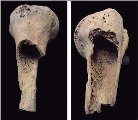 Figura 9 Húmeros que muestran el patrón de reducción en este segmento, debido a la fractura del eje de la extremidad para extracción de la médula ósea; además presentan afectación térmica indirecta, es decir cocción en un medio acuoso.