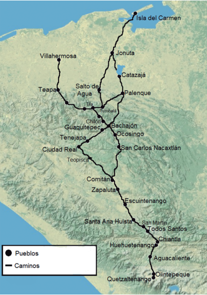 Al interior de Chiapas, los productos se movían por una nueva versión del antiguo camino de Los Zendales (Viqueira, 2002: 149-150).42 Los viandantes que llegaban a Chiapas procedentes de Campeche hacían una primera parada en Playas de Catazajá para luego dirigirse a Palenque, ubicado a unas seis leguas de distancia. Posteriormente, marchaban en dirección a Tumbalá, para lo cual tenían que hacer un recorrido de casi 30 leguas de camino áspero, en el que se subían y bajaban numerosas cuestas y atravesaban varios ríos que solían desbordarse en temporada de lluvias. Ya en Tumbalá, los pasajeros tomaban rumbo hacia Tila, Petalcingo, Yajalón, Chilón y Bachajón -esto implicaba recorrer más de 10 leguas de camino atravesando montes y pequeños valles-, para luego partir con dirección a Ocosingo. Finalmente, desde este pueblo se enfilaban hacia Comitán, ubicado a 22 leguas, a través de un camino que cruzaba por la selva, y en el que los únicos puntos de descanso eran las haciendas Jotaná, Yaxhá y Palma Real. Finalmente, desde Comitán -que pronto se convirtió en el corazón de este circuito comercial- los mercaderes y sus cargas accedían al Camino Real que unía Chiapas con Los Altos de Guatemala, en particular con el importante pueblo de Quetzaltenango.43