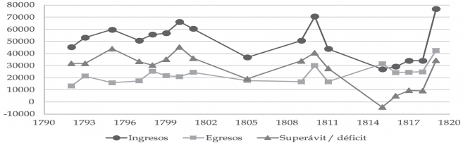 Como se aprecia en la Gráfica 1, más que un experimento fallido, la Caja Real que se instaló en 1787 en Ciudad Real resultó, en términos generales, un éxito para la Corona. Entre 1792 y 1819, sobre unos ingresos de $835 416 se registraron gastos que ascendieron a $387 808, produciéndose un superávit de $462 452, es decir, de $27 203 anuales en promedio.