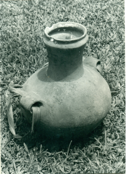 Figura 4 Cántaro hallado en el lago de K’ak’ (selva de Chiapas) proveniente de una cueva funeraria, 1975.