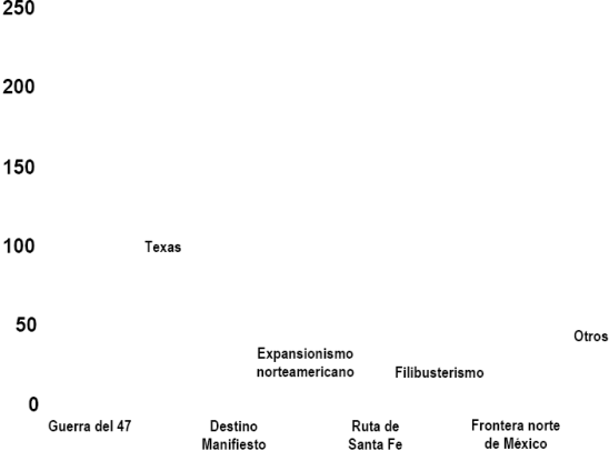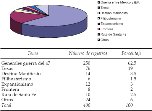La producción sobre la guerra entre México y los Estados Unidos o guerra del Cuarenta y Siete es marcadamente mayoritaria; le siguen, en términos cuantitativos, los temas texanos, que comprenden desde el periodo español de la comarca, su colonización por angloamericanos y los negocios inmobiliarios especulativos, la independencia o revolución de Texas -como se denomina en la historiografía estadounidense-, la anexión de la nueva república a la Unión Americana, así como la relación de estos dos últimos fenómenos con la guerra mexicano-norteamericana o con la propia Guerra Civil . Muy distantes en términos porcentuales quedan los temas acerca del destino manifiesto (1 . 75%), expansionismo norteamericano (1 .5 %), la ruta comercial de Santa Fe (1. 25%), los filibusteros (0 . 75%) y frontera norte de México (0 . 75%).