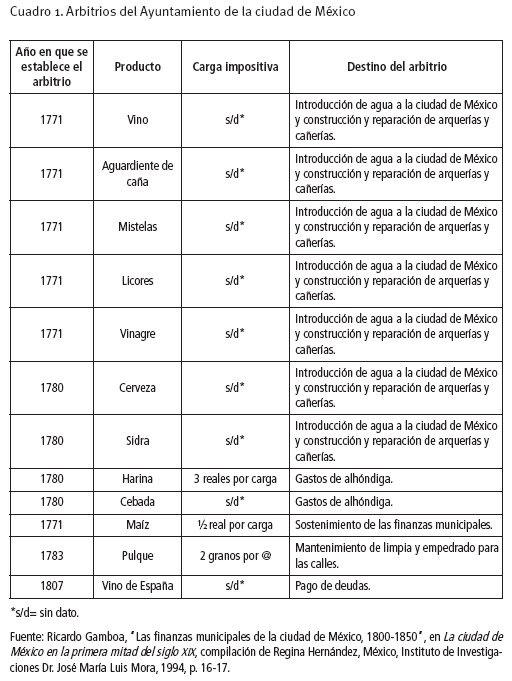 La economía municipal tuvo distintos matices. Si bien había una legislación que regía a todos los ayuntamientos, el de la ciudad de México siempre tuvo algunas excepciones debido a la importancia que la capital novohispana representó a lo largo de casi trescientos años. Los ingresos que sostenían a los ayuntamientos eran conocidos como propios y arbitrios. Éstos fueron privilegios que la Corona española otorgó y estableció desde el siglo XVI para la manutención de las municipalidades. Con el tiempo se dieron algunas modificaciones en los arbitrios. Ricardo Gamboa señala que para la ciudad de México éstos se especificaron a partir de las reformas fiscales instauradas tras la visita de José de Gálvez a la Nueva España.13