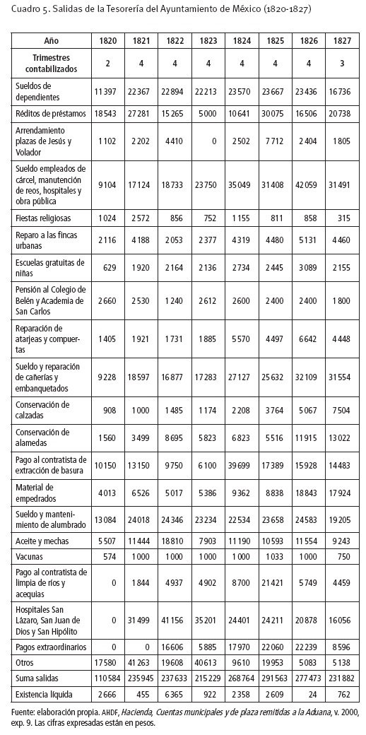 En el cuadro 6 se presenta un balance general de las finanzas al interior de la Tesorería del Ayuntamiento de México, identificando así la existencia anterior, las entradas, las salidas y la existencia líquida para el periodo entre 1820 y el penúltimo tercio de 1827, el cual destaca notablemente por el tránsito de tres formas de gobierno: Virreinato, Imperio y República.