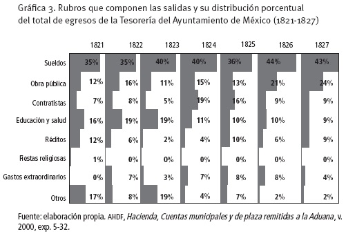 El aumento en sueldos durante el último periodo de análisis se explica por el incremento en el número de comisiones creadas dentro del Ayuntamiento (de haber diez bajo el virreinato, se elevó a veinticinco durante la República). Respecto de "obra pública" se observa que entre 1826-1827 hubo un mayor gasto en obras como construcción de puentes, embanque-tados, conservación de atarjeas y reparo de calzadas, entre otras. Lo anterior sugiere que el Ayuntamiento invirtió paulatinamente en la infraestructura capitalina derivado de las crecientes demandas de servicios ante un aumento urbano. Para el gasto en educación y salud es particularmente notable la disminución hacia los años 1825 a 1827, debido a que entre 1822 y 1823 se compraron vacunas y se dio cobertura de varias necesidades en los hospitales de San Lázaro, San Juan de Dios y San Hipólito, mientras que lo erogado en 1825 fue menor; ese 10% se destinó a "el socorro para la epidemia de sarampión" que se presentó en dicho año.33