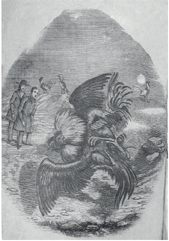 En este periodo se confrontaron, por lo tanto, visiones contrapuestas de Santa Anna como héroe y villano, y El Gallo Pitagórico abonó en la segunda. Sus artífices, Morales y el editor Cumplido, habían tenido un lugar muy destacado en el grupo antagonista al general, y particularmente en la disputa periodística desde El Siglo Diez y Nueve, el principal periódico de oposición y medio de expresión de los liberales moderados, del cual el primero era redactor en jefe y el segundo propietario. Ahí, entre enero de 1842 y septiembre de 1844, Morales publicó seis de los siete extensos artículos que conformarían posteriormente la edición ilustrada de El Gallo Pitagórico,15 los cuales, junto con una infinidad de escritos más, entre ellos los publicados en otros periódicos, sirvieron para cuestionar las acciones de la administración de Santa Anna y para dar fuerza y promover los puntos de vista de los moderados. Conforme la oposición cobraba o perdía fuerza, la crítica en la obra de Morales fue más o menos evidente, pero fue siempre velada. Incluso en el último texto, publicado sólo al aparecer el libro, cuando el general ya había perdido el mando y se encontraba prisionero en Perote esperando ser juzgado, la alusión aunque más constante y evidente, mantuvo su carácter elusivo; en este artículo Morales lo hizo encarnar metafóricamente en Cola de Plata,16 según vox populi su gallo favorito, plasmando así, sin mencionar su nombre, una de las importantes recriminaciones que se le hicieron por entonces al general: su gusto irresponsable por el jolgorio y el dispendio a costa del erario público.17 Asimismo, se eludió representar de forma directa en las ilustraciones de El Gallo Pitagórico la fisonomía de Santa Anna, que sólo se plasmó discretamente en un grabado de la contracubierta de los forros que acompañaron las entregas, conservados en muy pocos de los ejemplares que existen del libro, en donde se le muestra como un gallo cojo (ejecutado por el entonces grabador Rafael de Rafael,18 lámina 1). Más allá de esta salvedad, la imagen que enseguida revisaremos es una clara muestra de la tendencia a aludir al general de forma indirecta, y analizarla dentro el contexto histórico permitirá entender el porqué de dicha actitud.