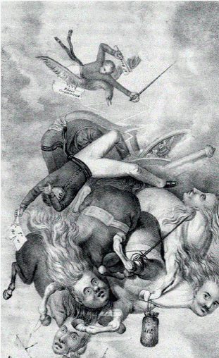 Desde el punto de vista de la oposición, eran muchas las cosas que en una imagen como la que ahora se cita se le podrían haber achacado al depuesto militar para explicar el porqué de su debacle en 1844. Varias de ellas fueron enunciadas en el resto de El Gallo Pitagórico y sus imágenes,22 pero también en varias caricaturas anónimas que circularon por entonces, y que se refieren específicamente a la derrota del polémico general en 1844 y a los hechos precedentes o subsecuentes; en casi todas éstas, al igual que en la imagen de Faetón, se aludió a su degradante caída,23 pero en la totalidad de ellas, en mayor o menor grado, asoma la fisonomía de Santa Anna, generalmente con su pata de palo que lo hace inconfundible. Por el contrario, esta explicitud no ocurre ni en la estampa de Faetón, ni en ninguna otra de El Gallo Pitagórico, salvo, de forma discreta, en la ya mencionada que aparece en la contracubierta (lámina 1). Además, en lo que pareciera una especie de autocensura, a esta lámina del Faetón no se le puso el título que inicialmente se le pensaba asignar, según el anuncio con que se promocionó el libro, el cual resultaba mucho más explícito respecto de lo ahí representado: Caida del Faetonte político, ó sea de la administracion revolucionaria.24