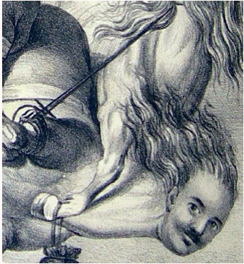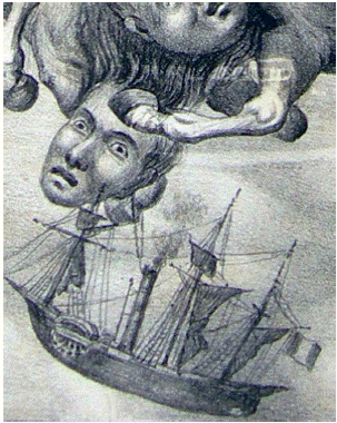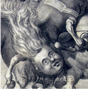 Lámina 10 Detalle invertido y además virado de posición, de la litografía de Plácido Blanco, Que Júpiter con sus rayos los arrojara de cabeza al lago de Texcoco, ilustración interior de El Gallo Pitagórico, 1845