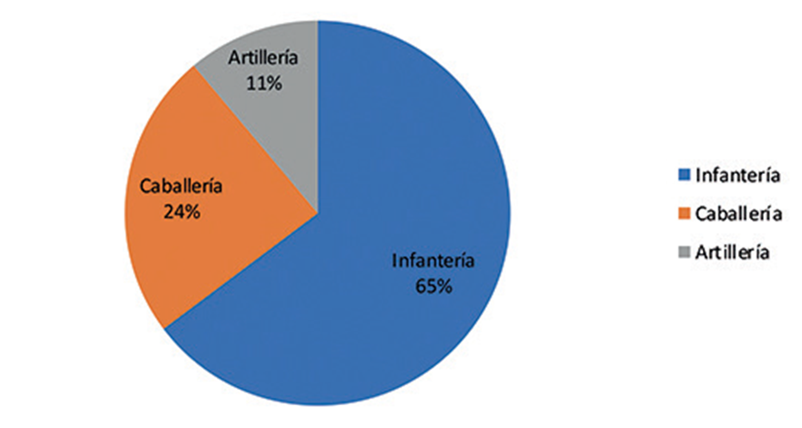 Los diez pueblos señalados tenían en pie las tres armas, con la sola excepción de la infantería en San Juan de la Vega, donde se contaba sólo con 48 elementos montados y 5 de artillería. Este dato resulta curioso, ya que como se observa en la Gráfica 2, la inmensa mayoría de las fuerzas totales, 65%, lo conformaba la infantería, es decir, dos terceras partes, en tanto que 24% eran montados representando a los 793 elementos de caballería, que tenían a su disposición 890 caballos, lo cual es muy significativo ya que no he podido registrar ningún otro caso en el que haya un superávit tan grande de estos animales respecto a la tropa.