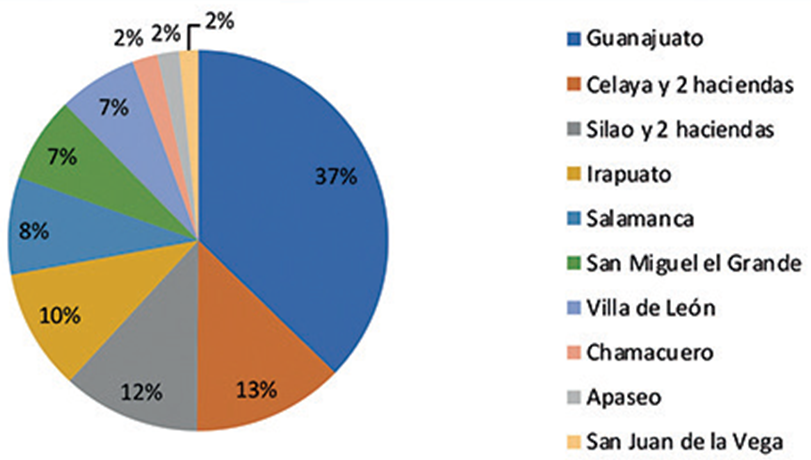 Se puede ver en la Gráfica 4 que la mayor parte de las fuerzas seguían siendo originarias de Guanajuato, pero ahora con 24% del total, y no ya con 37 como un año antes. Sobresalen como poblados secundarios Irapuato, Silao y Salvatierra, con 11-12%, mientras que Celaya, que había sido el segundo con más elementos, ahora se encontraba como séptimo. Es posible que en este momento se haya dado la separación de las subdelegaciones militares de Salvatierra y Acámbaro, ya que previamente éstas pertenecían a Celaya y posiblemente sus fuerzas habían formado parte de esta jurisdicción.