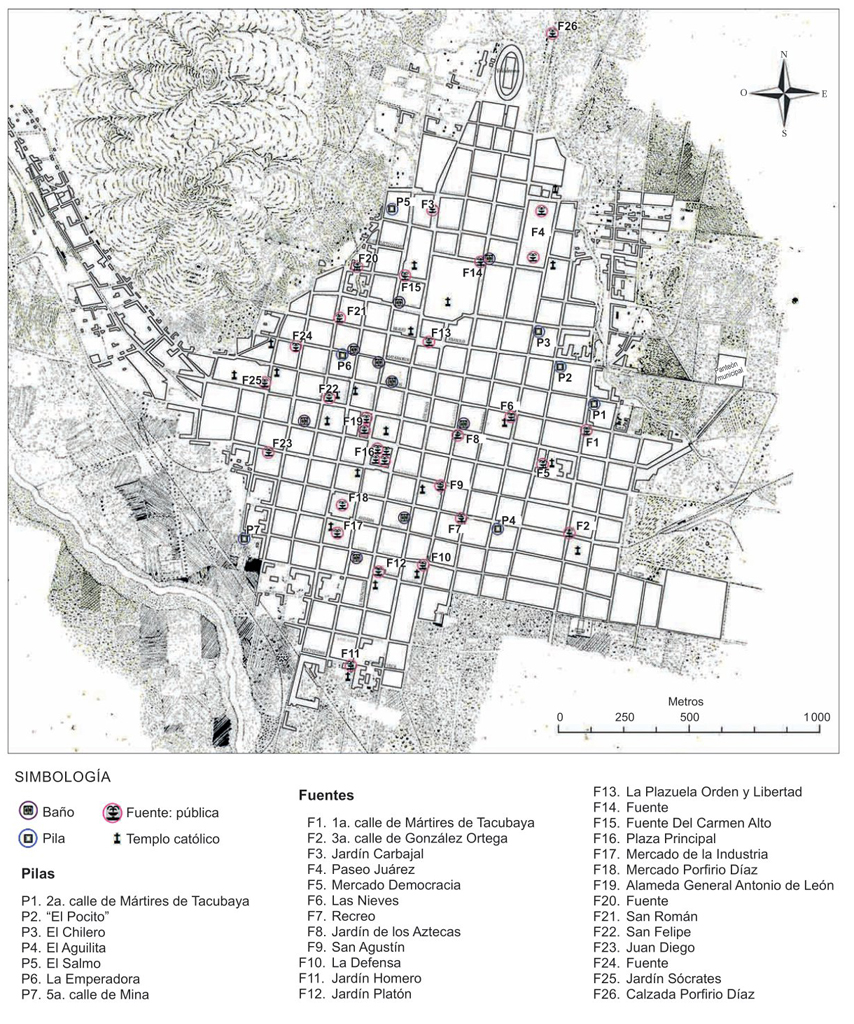 Con base en la recopilación de las fuentes y pilas que había en la ciudad entre 1885 y 1910, se sabe que las primeras eran en número de 30, pues había sitios como la plaza principal, la Alameda General Antonio de León o el Paseo Juárez que tenían más de una fuente; en tanto que las segundas, sólo 7 (véase el plano 1). Resultó un tanto difícil distinguir unas de las otras, puesto que muchas veces se referían a ellas de manera indistinta pese a que arquitectónicamente existen sus diferencias. Si bien ambas son contenedoras de agua y pueden estar fabricadas de los mismos materiales (piedra, ladrillo o hierro), las fuentes llegaron a tener diseños más sofisticados respecto a las pilas que eran más sencillas, incluso, más pequeñas (véase la figura 3). También fue complejo identificarlas debido a que algunas fueron trashumantes, y otras, desaparecieron. Igualmente resultó un reto reconocerlas por su nombre porque muchas fueron bautizadas coloquialmente por la gente y conocidas por los parroquianos. A la luz de nuestros días esos nombres se han olvidado.