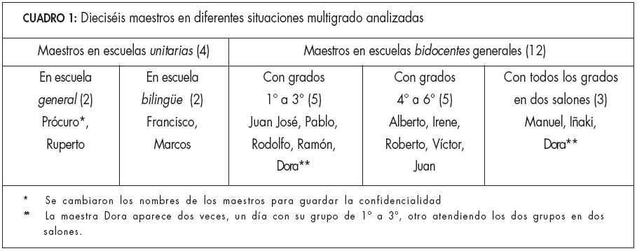 Las observaciones de clase se efectuaron con registros apoyados en grabaciones. En escuelas unitarias, una observadora se centraba en el maestro, la otra en un grupo de alumnos; en bidocentes cada una cubría un maestro. Se obtuvieron 112 registros de clases multigrado y como referente de comparación 56 registros de clases en escuelas rurales cercanas "grandes", con docente por grado. El siguiente análisis se basa en los registros de observación de uno o dos días enteros de clase de 16 maestros.