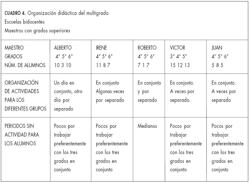 En las dos escuelas unitarias con seis grados, los maestros Prócuro y Ruperto (véase cuadro 2) manejan por separado los primeros tres, pero al cuarto, quinto y sexto, los conducen como un conjunto homogéneo. Durante los días de observación, sólo para algunas actividades los diferencian: en una clase de Historia, cada grado lee la lección en su respectivo libro de texto y contesta preguntas correspondientes. Aun en escuelas bidocentes, tres maestros (Irene, Víctor y Juan (véase cuadro 4) que atienden a cuarto, quinto y sexto, tratan a esos grados la mayor parte del tiempo como un solo grupo.