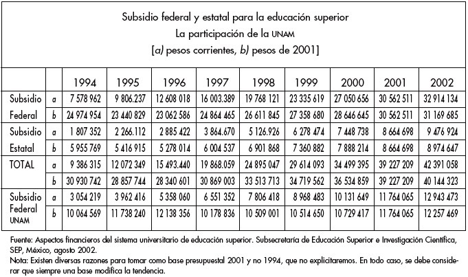 Es necesario considerar algunos elementos para analizar esta información. Aparentemente el subsidio federal es cuatro veces mayor en 2002 que en 1994, no obstante conviene recordar que en ese año el dólar estaba en una paridad cercana a los tres pesos; después del "error de diciembre" se elevó a más de seis pesos, para colocarse en 1999 en cerca de nueve pesos. Por cada peso que los estados invertían en la educación superior en 1994 la federación dedicaba 4, mientras que en 2002 esta relación se redujo a 3.5. Ciertamente el presupuesto ha crecido en los últimos años, sin embargo es importante observar que en 1994 estaban inscritos en el sistema 1 312 900 alumnos, de los cuales 1 032 300 se encontraban en el sector público, mientras que para 2002 el número de inscritos ascendía a 2 106 254 estudiantes, de los cuales 1 324 926 pertenecen al sector público.