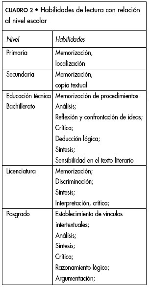 En los niveles de educación básica y técnica se distinguen tres tipos de textos que aglutinan las lecturas: a) los textos para conocer, de carácter informativo; b) los textos para saber hacer, de tipo prescriptivo, es decir, cuya estructura es imperativa, y c) los textos para hacer, de tipo dialógico, como cuestionarios. En el bachillerato empiezan a aparecer otros, más alejados de lo meramente informativo, dando paso a una lectura más argumentativa. En la licenciatura se observa la lectura técnica especializada de tipo profesionalizante disciplinaria. En el posgrado se incrementa la especialización temática.