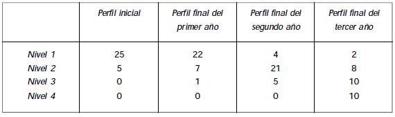 La columna "Final del tercer año" muestra que al término del estudio hubo dos profesores que se mantuvieron en el nivel 1 durante los tres años; ocho llegaron al nivel 2, de éstos ocho, dos provienen del nivel 1 y seis se mantuvieron en el nivel 2. En el nivel 3 concluyeron diez profesores, todos del nivel 2. Finalmente, diez profesores alcanzaron el nivel 4, de ellos cinco provienen del nivel 3 y cinco del nivel 2.