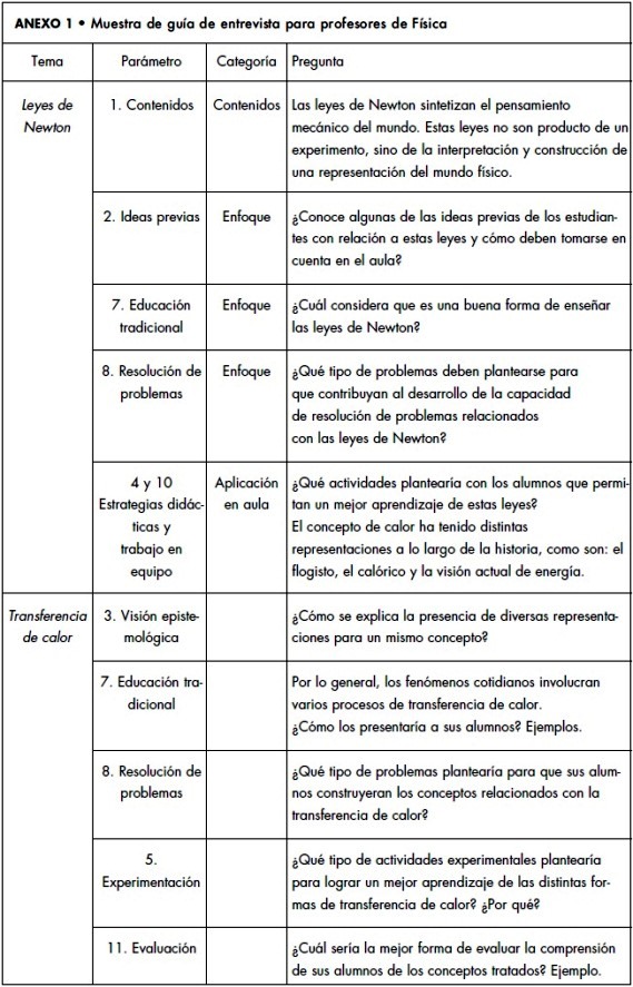 Las preguntas de la entrevista se formularon mediante el establecimiento de problemas análogos en cuanto a situaciones didácticas a los aplicados en los exámenes nacionales de acreditación (Exámenes de Acreditación. Indices Estadísticos de los Reactivos 1999-2000 y 2000-2001, SEP). Para el desarrollo de la entrevista se determinaron los contextos fenomenológicos (por ejemplo, situaciones de clase en las que se propone al profesor un escenario donde tendría que describir cómo reaccionaría o qué haría, por ejemplo, cómo respondería ciertas preguntas de sus alumnos, cómo abordaría un determinado experimento, etc.) que permitieran averiguar, de manera sistemática, las tres categorías descritas que incluyen los 11 parámetros descritos arriba. En el caso específico de los contenidos, éstos se abordaron a partir de la misma situación y contexto que se utilizaron para las demás categorías, reconociendo que hay una dependencia entre el contexto y la idea de ciencia expresada (Leach, 1999).