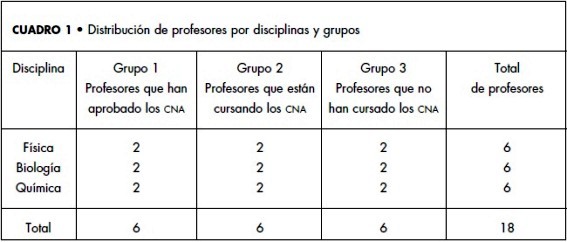 Para desarrollar esta investigación exploratoria se eligió un total de 18 profesores de secundaria, correspondientes a las tres disciplinas que comprende el área de ciencias naturales. Esta población fue seleccionada por tres grupos o estratos: profesores que aprobaron los CNA, aquellos que estaban cursándolos en el momento de la aplicación y quienes no los habían cursado. La distribución de los profesores se muestra en el cuadro 1.