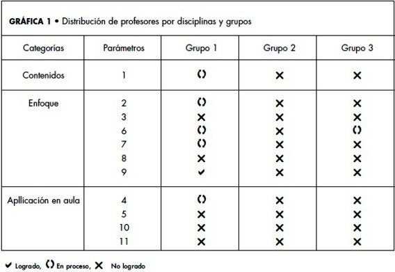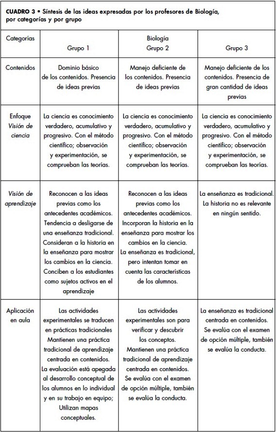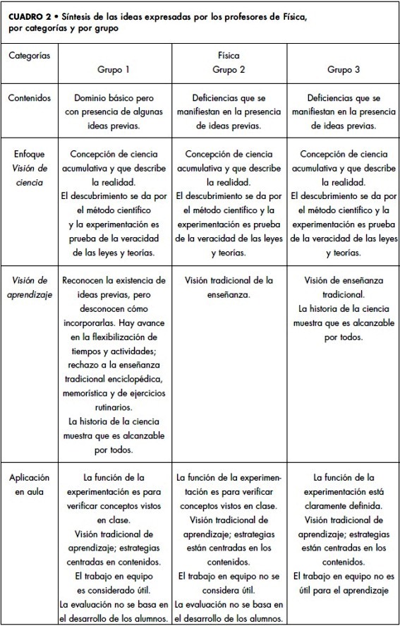 A continuación se muestra en los cuadros 2, 3 y 4 una síntesis de las ideas expresadas por los profesores de cada disciplina de acuerdo con las categorías que integran cada uno de los distintos parámetros.