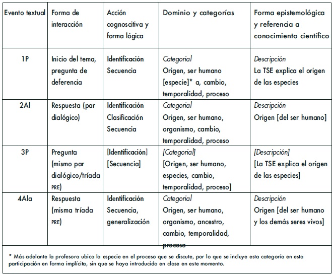 Cada participación constituye un evento textual. Es la unidad de análisis del proceso interactivo. En el primero, la profesora inaugura la interacción de la primera sesión con el inicio del tema (forma de interacción, que marca la autoridad del profesor en la conducción de la clase) sobre la TSE, que ella conoce y le sirve de base, mediante una pregunta de deferencia (forma de interacción) solicitando se identifique (acción cognoscitiva) el origen del ser humano en el contexto biológico (referencia a conocimiento científico), para llegar, mediante otras preguntas, diálogos y actividades, a comprender el origen de las especies según la TSE (tesis que se sustenta). El tema se aborda en forma epistemológica descriptiva (solicita identificación, no explicación), en una forma lógica secuencial, y desde un dominio categorial que incluye nociones de origen, ser humano, cambio, temporalidad y proceso (componentes todas ellas de la estructura del conocimiento según la TSE). El cuadro de la siguiente página presenta estos elementos y aquellos de los eventos subsecuentes (los eventos textuales se numeran consecutivamente, indicando el participante).