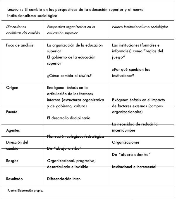 Asimismo, entre la literatura de la educación superior y el nuevo institucionalismo encontramos un punto de encuentro a partir de la concepción que ambas perspectivas asumen sobre el cambio. Desde la educación superior, el estudio del cambio no se reduce a fijar la atención en la identificación de alteraciones específicas sino en entender la manera en que los patrones de las actividades sustanciales (investigación y docencia), las creencias, y las formas de autoridad influyen de manera conjunta en los cambios en el ámbito de las instituciones (Clark, 1983, 1991). De esta manera, el cambio es el resultado de un complejo proceso de continuos ajustes (estira y aflojes) en las instituciones. Igualmente, desde el nuevo institucionalismo, el cambio no se vislumbra como el resultado de una sola acción sino que el cambio institucional es un proceso que resulta de la tensión constante entre instituciones (reglas del juego) y organizaciones (North 1990, 1993) bajo ambientes específicos (Di Maggio y Powell, 1991, 1999).
