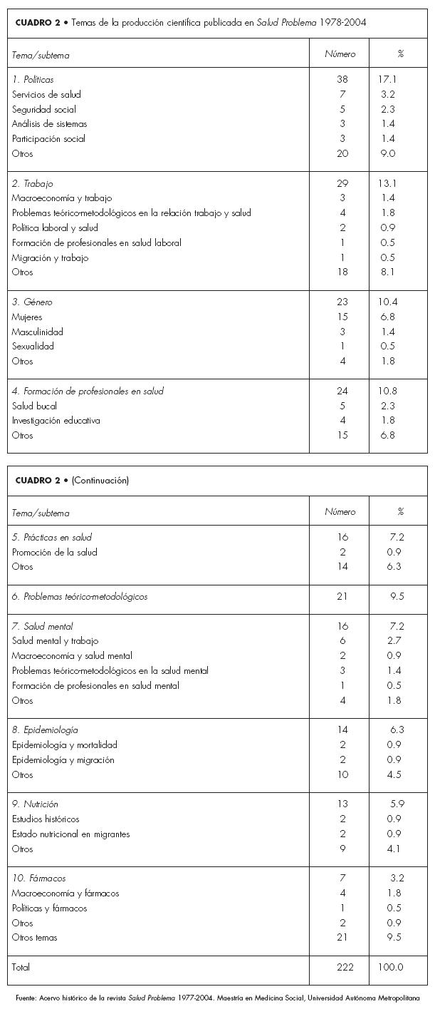 De acuerdo con la distribución porcentual de los temas, los más abordados son: las políticas (17.1%), el trabajo (13.1%), la formación de profesionales en salud (10.8%), los estudios de género (10.4%) y los problemas teóricometodológicos (9.5%) (véase cuadro 2). Esta distribución se explica por la permanente definición de los dos objetos de estudio de la MS; por un lado, el objeto que se refiere a la distribución y determinantes del proceso saludenfermedad tomó como base teórica al trabajo, de ahí el predominio de estudios publicados sobre este tema, sobre el mismo objeto, los estudios de género han buscado documentar la distribución desigual entre varones y mujeres ante la enfermedad. Respecto al segundo objeto de estudio de la MS (la respuesta social organizada para el proceso saludenfermedad), a éste pertenecen los temas: políticas de salud (el más frecuente del total), la formación de profesionales en salud y las prácticas en salud.
