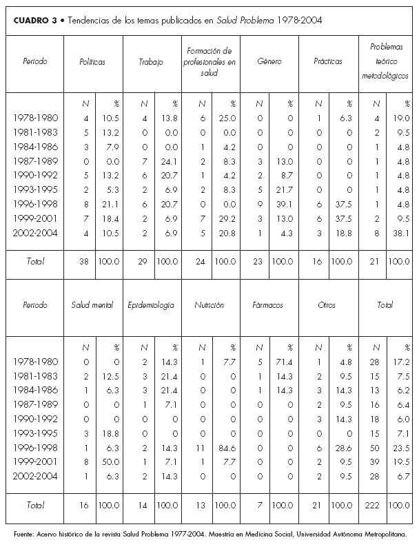 Salud Problema es una de las primeras publicaciones con enfoque médico social que se mantienen vigentes (otros casos en América Latina han desaparecido). La trayectoria de esta revista muestra que la amplitud de temáticas y la diversificación de subtemas, así como el predomnio inicial de trabajos de corte teóricometodológico y la posterior diversificación con un predominio de artículos originales permiten suponer una consolidación teórica del campo de estudio mediante la MMS.