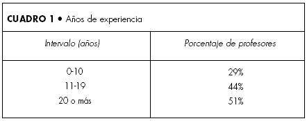 En cuanto a los años de experiencia (véase cuadro 1), se encontró que la mitad de los profesores (51%) tienen amplia experiencia docente 20 o más años de labor.