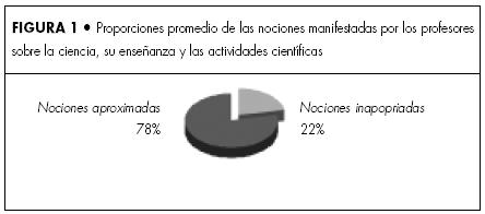 Se encontró que la mayoría de los docentes (81%) tienen una noción aproximada de lo que es la ciencia; esto significa que tienen cierto conocimiento acerca de ella, puesto que la conceptualizaron como un conjunto sistematizado de conocimientos; empero no pudieron explicar esta definición. Una pequeña parte de los docentes (19%) poseen una noción inapropiada de lo que es la ciencia; esto quiere decir que el concepto que poseen no es correcto, ya que la definen como una acumulación de conocimientos estáticos (es decir, no susceptibles a cambios) y esto se debe como previamente hizo notar Gutierrez Vázquez (1982) a que la escuela no concibe los conocimientos científicos como certezas provisionales, susceptibles a ser modificadas continuamente según el nuevo conocimiento que va surgiendo día con día. Con respecto a la enseñanza de las CN, una gran proporción de los profesores (77%) manifestaron que es un tipo de instrucción en el que se deben mostrar y comprobar leyes. Adicionalmente, en la parte del cuestionario donde se les pedía a los docentes que distinguieran las actividades científicas de las no científicas, se encontró que se les dificultaba realizar esa diferenciación, mostraron confusión entre las actividades científicas y las tecnológicas (76 por ciento).
